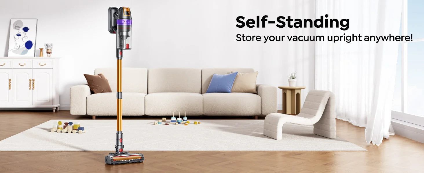 [Freestanding Design for Convenience] The vacuum stands freely upright on its own, allowing you to pause cleaning anytime without leaning it against walls. There’s no need to find support or worry about it tipping over. Its compact design enables easy storage in corners or behind doors, saving space.