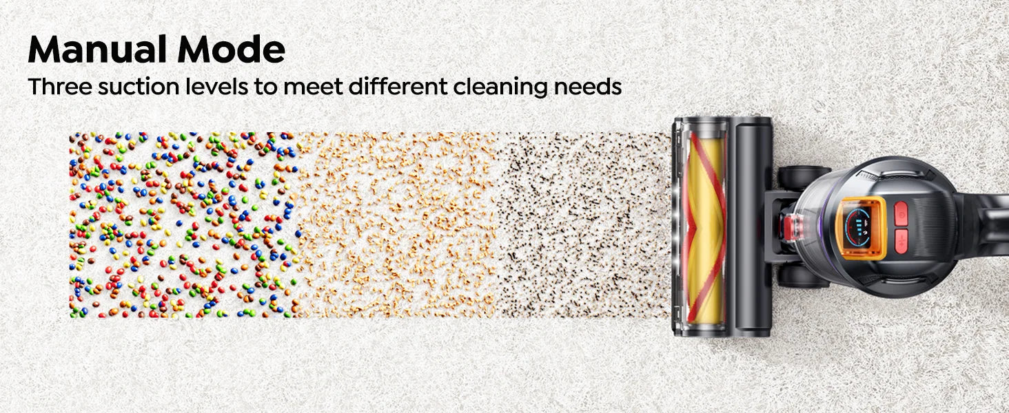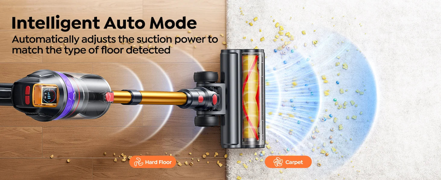 [Smart Cleaning Modes] You can switch to ECO, STANDARD, BOOST, AUTO suction modes with the top button and monitor the real-time status through the display. In AUTO mode, the cordless vacuum detects surface types, automatically adjusts suction power on hard floor to save battery life, and increases suction power on carpets for deep cleaning!