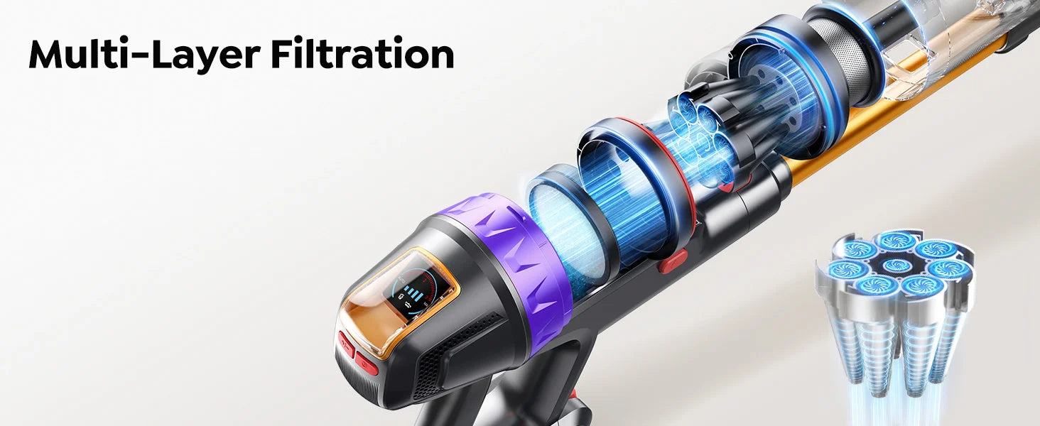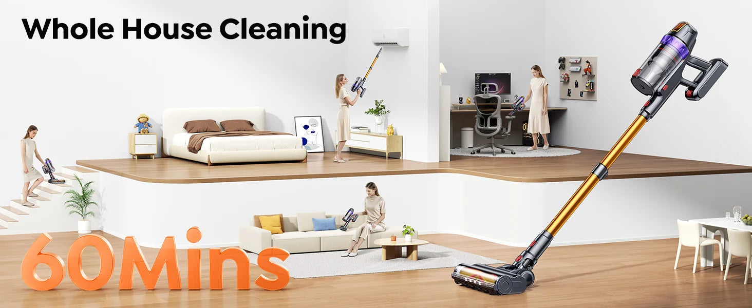 [High-Efficiency Brushless Motor] This cordless vacuum cleaner is powered by a high-performance brushless motor that delivers 65 kPa of suction force, approximately 30% stronger than most standard cordless vacuums. It effortlessly deep-cleans debris from carpets and hard floors, with anti-tangle technology to easily handle pet hair, toddler snack crumbs, and various household messes.