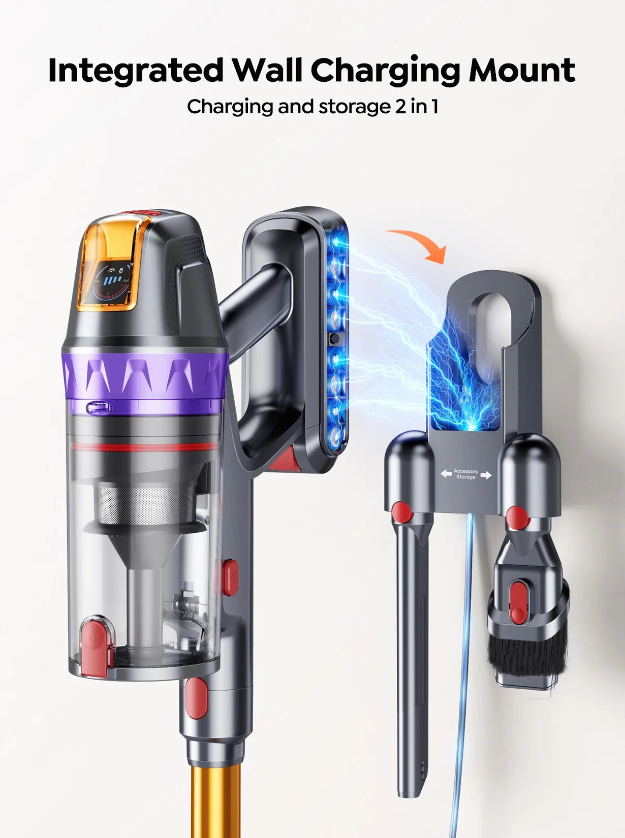 [Long-Lasting Battery and Flexible Charging] Equipped with an 8-cell lithium-ion battery, it provides up to 60 minutes of runtime in ECO mode (15 minutes in BOOST mode), sufficient for cleaning homes up to 2,500 square feet. The battery fully charges in 4 hours and can be charged via the wall-mounted dock or separately (without the dock).