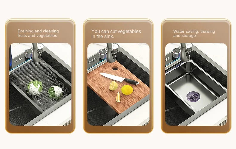 Trasforma la tua cucina con questo elegante lavello in acciaio inossidabile 304 con finitura nano black e rubinetto digitale a cascata. Design moderno e funzionalità avanzate si uniscono per offrirti un'esperienza culinaria superiore.