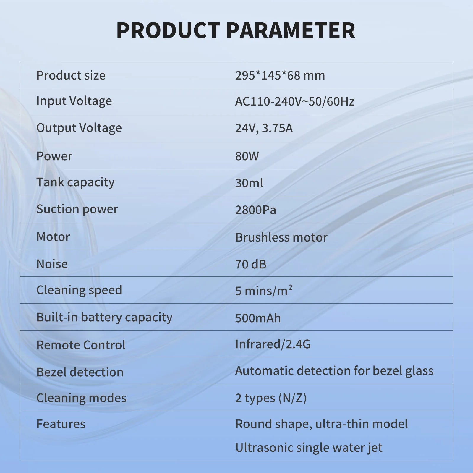 1. Wait 20 seconds after starting up until the blue light stop flashing,Then start working. Because the robot need 20sec to detect the glass plane.