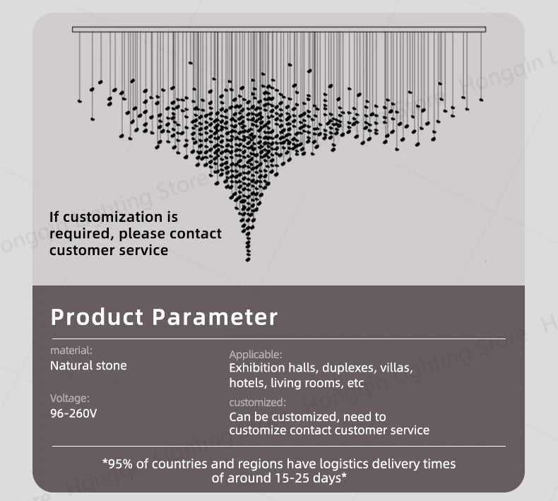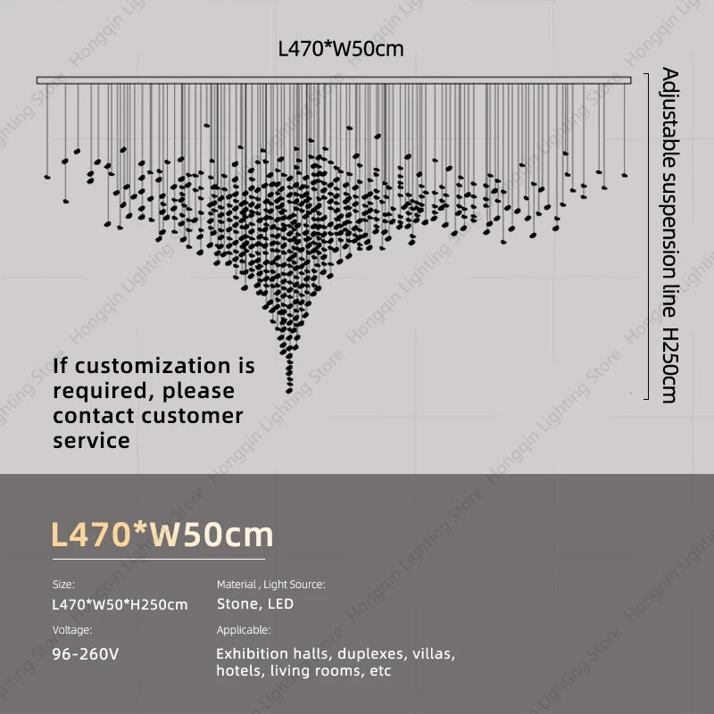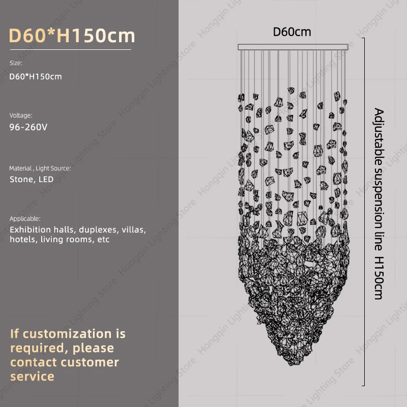 Il Lampadario Artistico Irregolare Black Art è un'opera d'arte contemporanea che ridefinisce il concetto di illuminazione di lusso. Ogni pezzo è caratterizzato da una forma irregolare unica, combinando pietre naturali selezionate e cristalli premium per creare un effetto visivo straordinario.