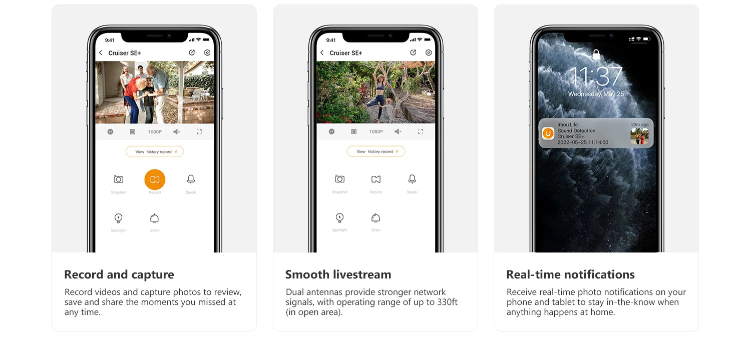 With IP66 certified, the camera can be used outdoors under different weather conditions. With built-in spotlight and 110dB Siren , Cruiser SE+ actively keeps unwelcome visitors away from what you care about.