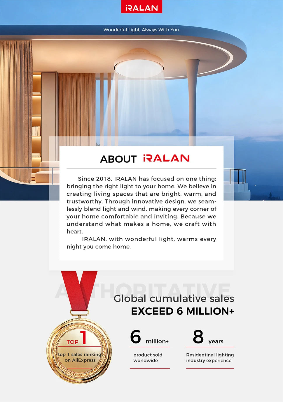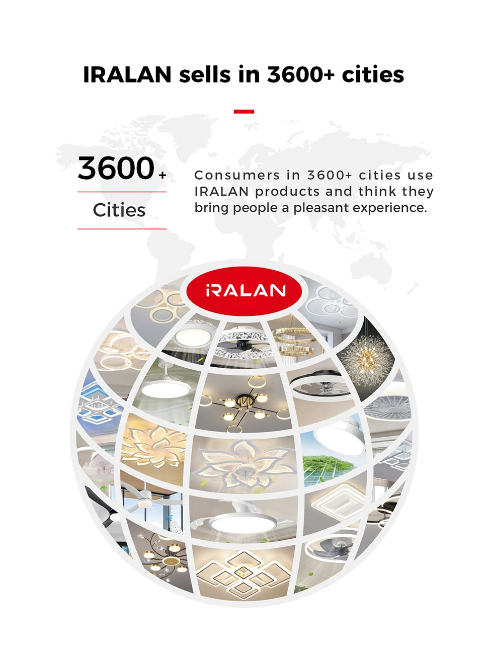 Rivoluziona il comfort e lo stile della tua casa con il ventilatore da soffitto IRALAN a pale retrattili, la soluzione intelligente che combina ventilazione efficiente, illuminazione LED dimmerabile e design ultra-moderno.