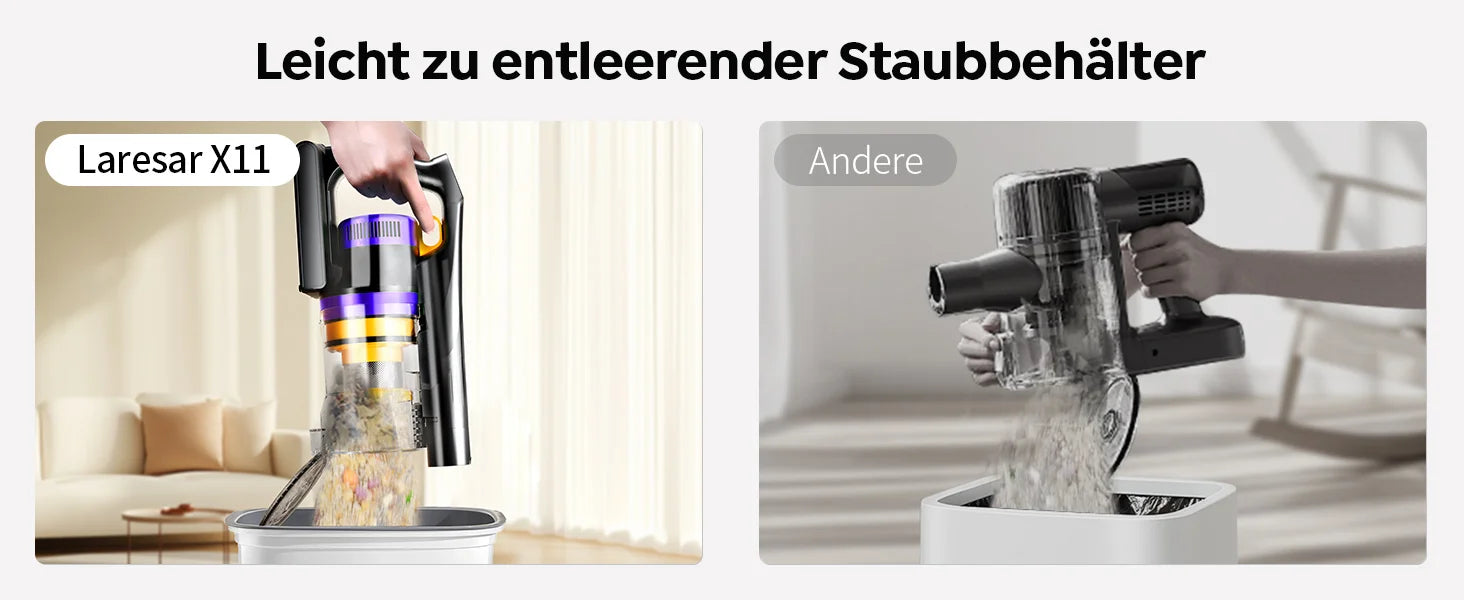 Immagina di pulire tutta la casa senza il fastidio dei cavi, con una potenza di aspirazione che rivaleggia con gli aspirapolvere tradizionali. Il Laresar X11 combina libertà di movimento e prestazioni professionali, permettendoti di raggiungere ogni angolo della casa - dai pavimenti ai soffitti, dalle scale all'interno dell'auto.