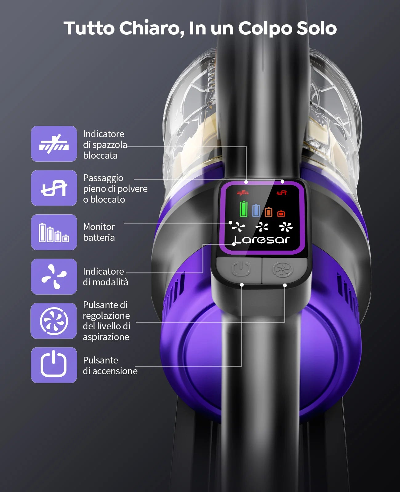 Scopri la pulizia senza compromessi con l'aspirapolvere senza fili Laresar X11. Con una potenza di aspirazione di 55000PA e un motore da 550W, questo dispositivo offre prestazioni da aspirapolvere professionale nella comodità di un formato cordless.