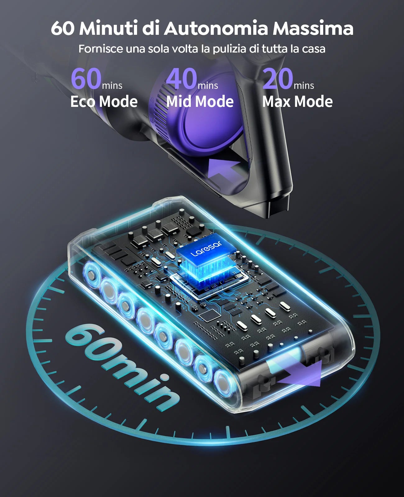 Aspirapolvere Senza Fili Laresar X11 550W 55000PA - Potenza Ciclonica 60 Min Autonomia