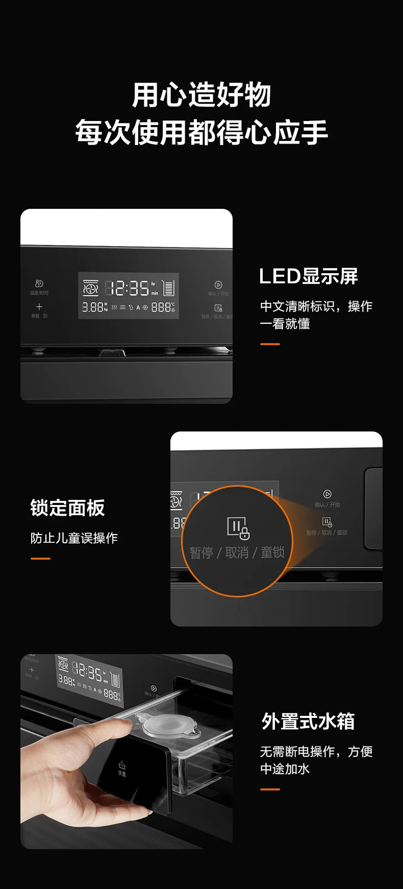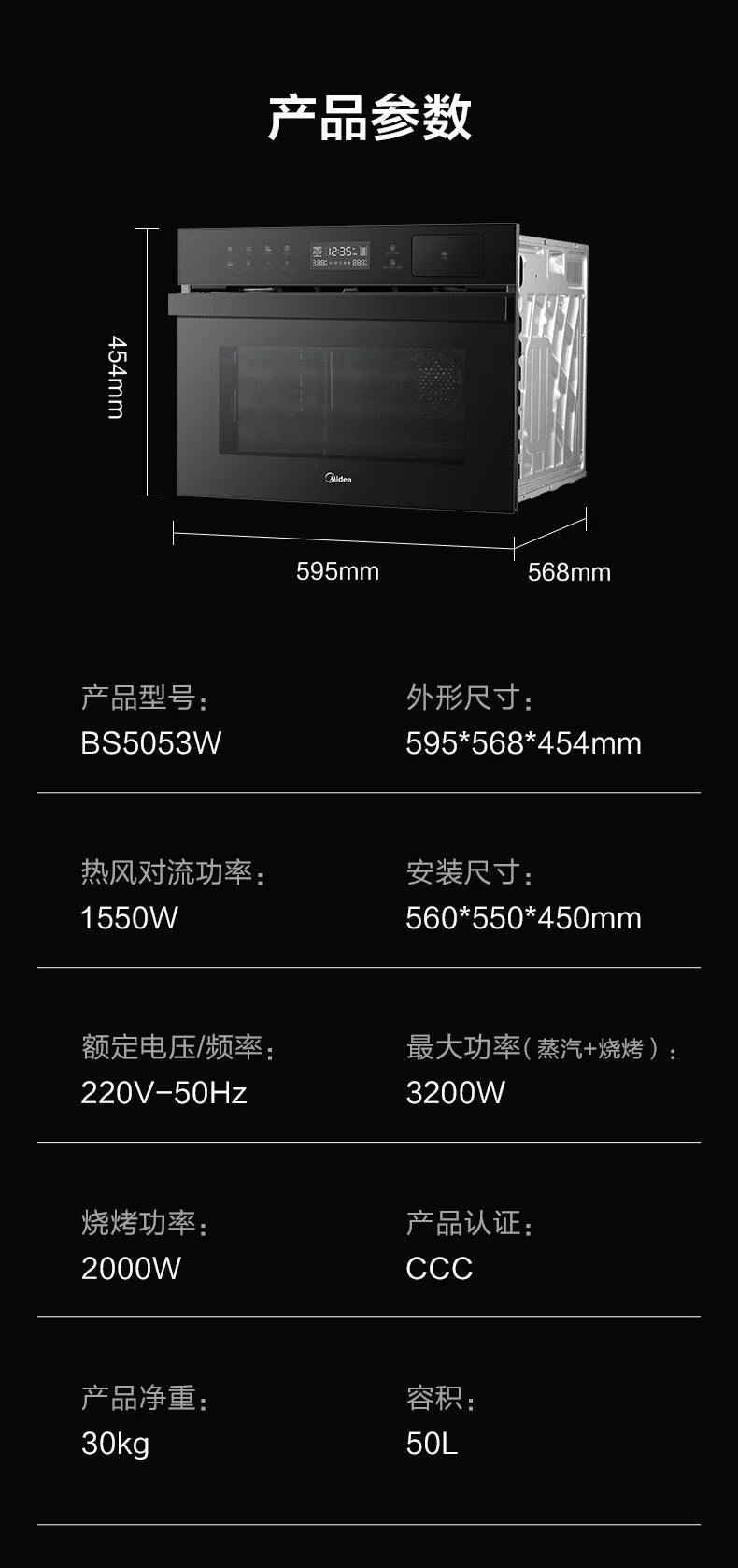 Il forno da incasso Midea da 55 litri unisce la cottura a vapore e la funzione grill in un’unica soluzione intelligente. Dotato di rivestimento in smalto antiaderente, sistema di pulizia automatica e controllo touch, è perfetto per chi cerca prestazioni professionali in cucina domestica. Ideale per pizza, arrosti, verdure e dolci, con design elegante e installazione integrata.