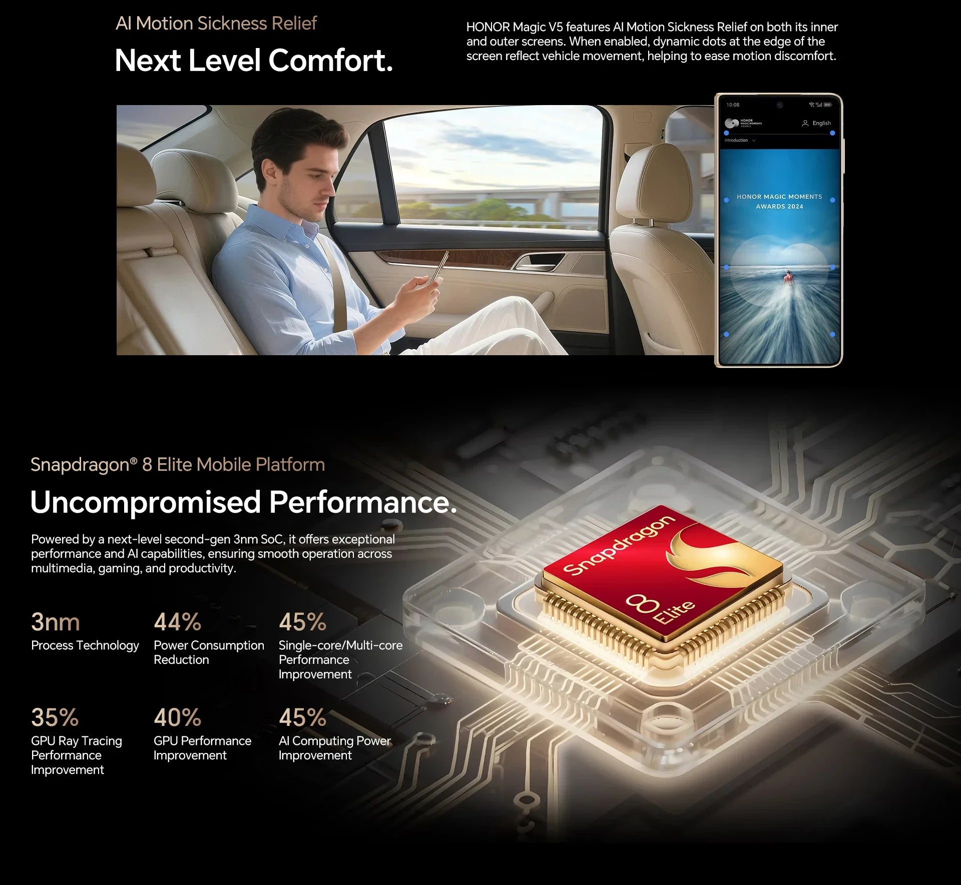 Il processore Snapdragon 8 Elite di ultima generazione offre prestazioni AI avanzate, gaming senza compromessi e efficienza energetica superiore. La batteria da 5820mAh garantisce autonomia per l'intera giornata, mentre la ricarica rapida 66W ti libera dall'ansia da batteria scarica.