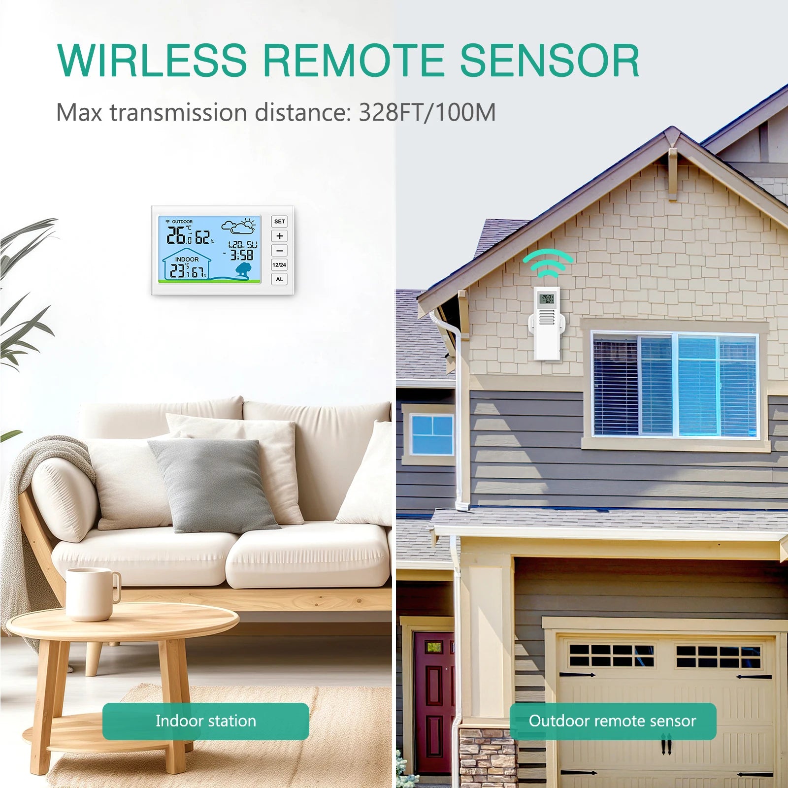 【Reliable Wireless Technology】: Benefit from stable wireless transmission technology in our indoor and outdoor thermometer. Both the main unit and sensor update every 30 seconds, with a transmission distance of up to 100m in open spaces, ensuring strong and stable data transmission.