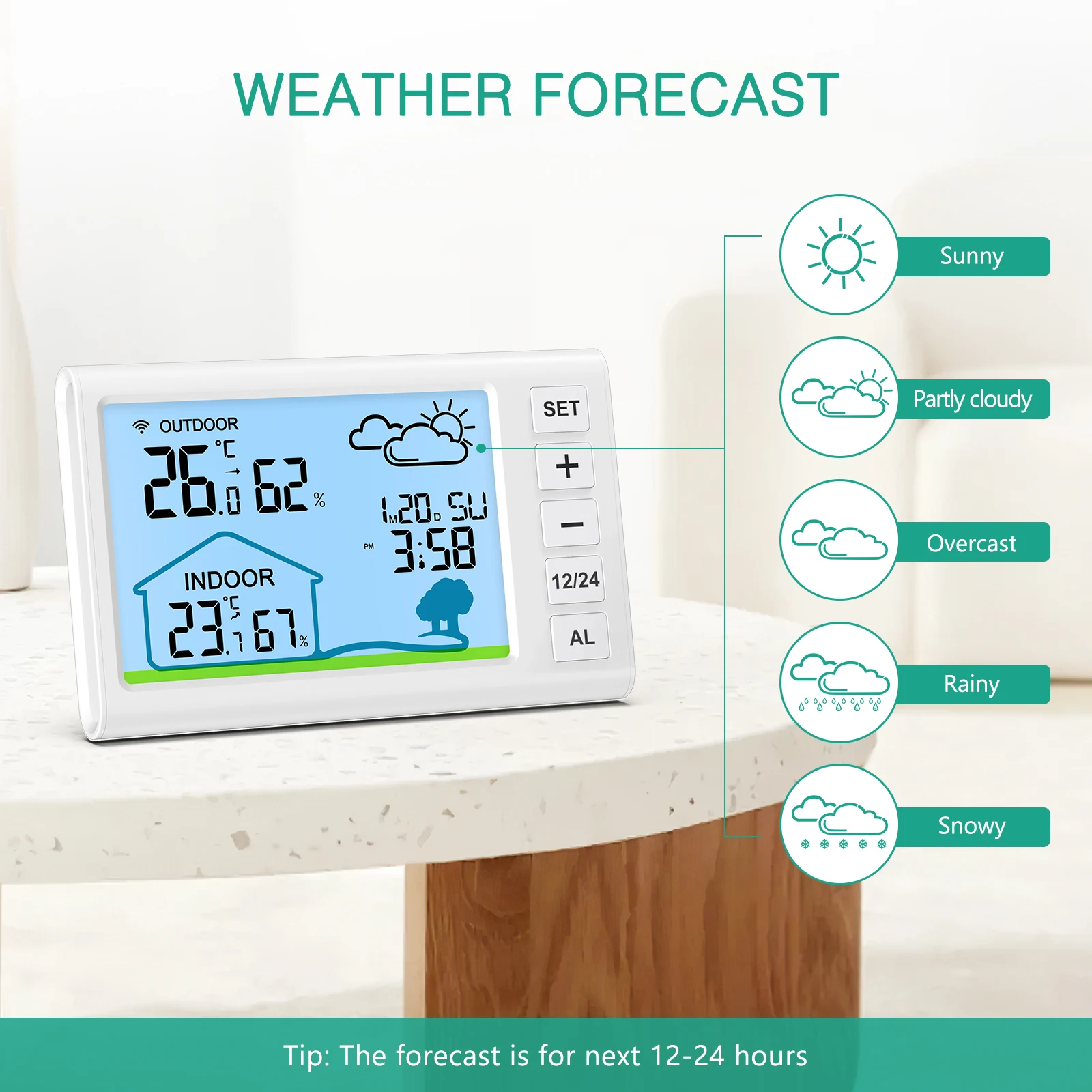 【Weather Forecast Function】: Stay ahead with our wireless humidity thermometer that provides real-time weather forecasts, indoor and outdoor temperature, and humidity readings. The built-in barometer sensor predicts weather conditions for the next 12 to 24 hours, aiding in your planning.
