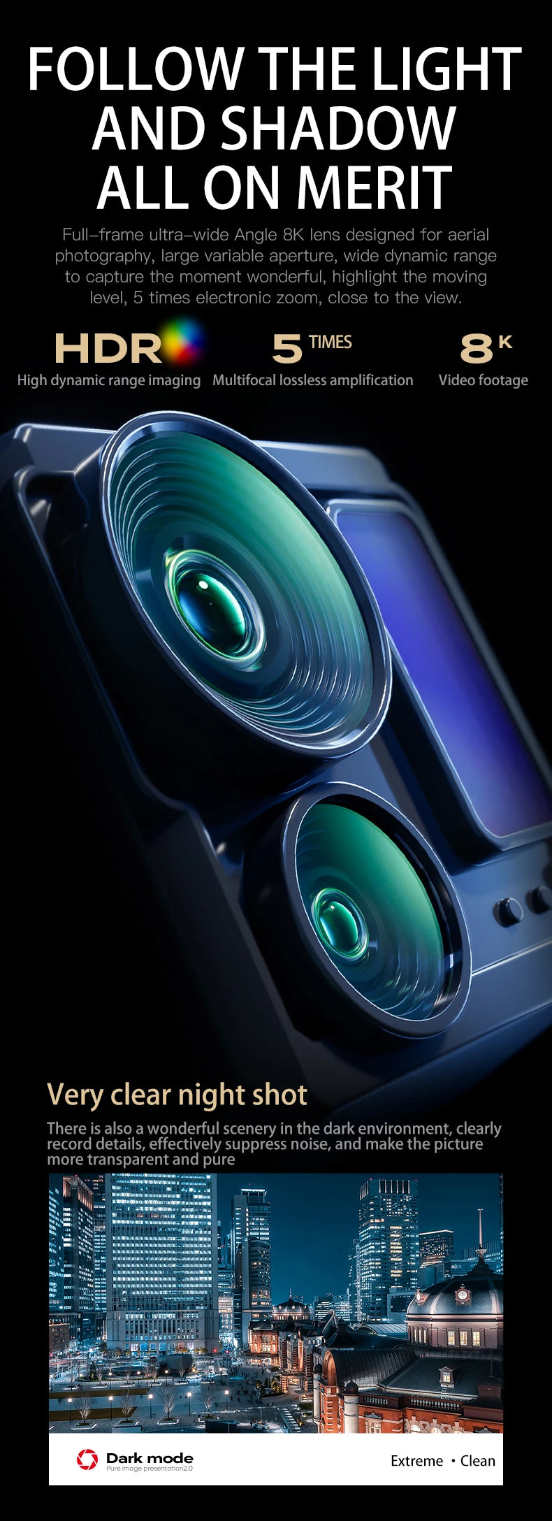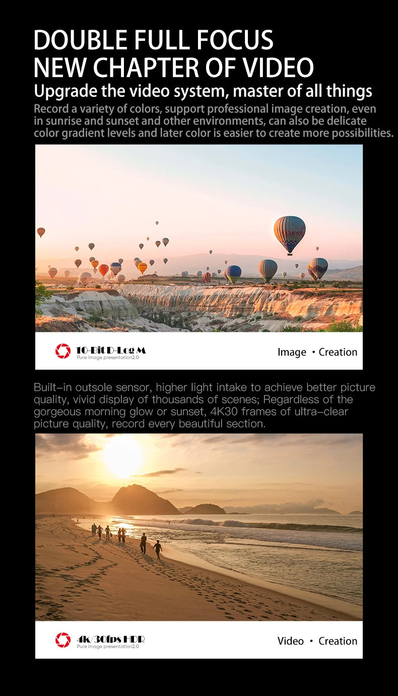 La camera 8K con gimbal stabilizzato garantisce riprese fluide e dettagliate anche in condizioni di vento. Perfetto per videografi, content creator e professionisti che richiedono la massima qualità d'immagine.