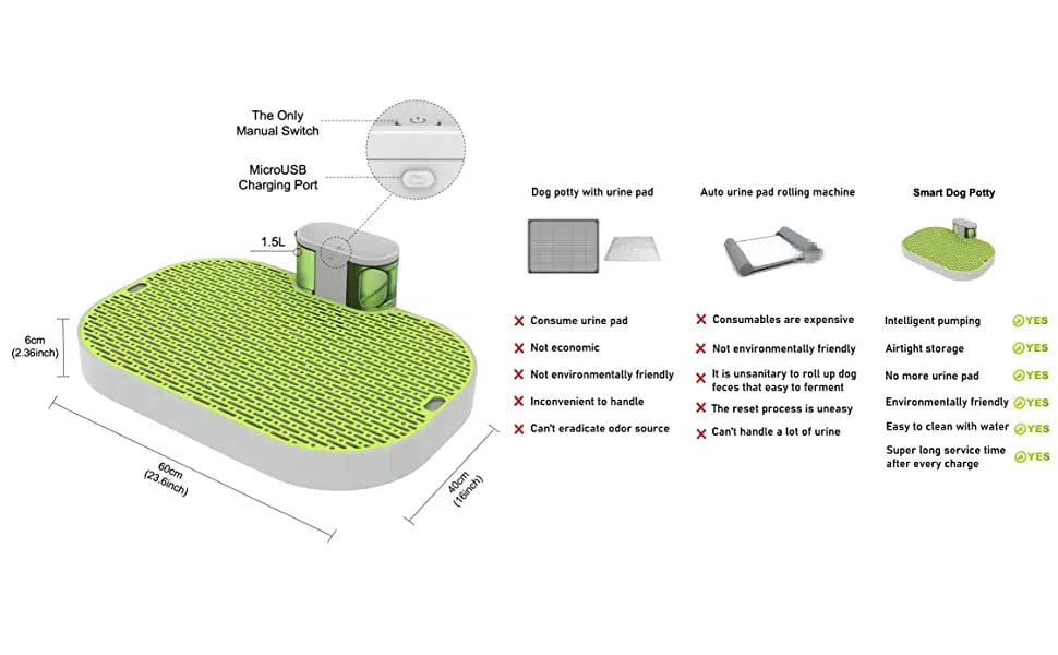 Ideale per chi vive in appartamento, per l'addestramento dei cuccioli, per cani anziani con difficoltà motorie o semplicemente per avere un'alternativa igienica quando non puoi portare fuori il tuo cane. Risparmia tempo, denaro e contribuisci all'ambiente eliminando i tappetini usa e getta.