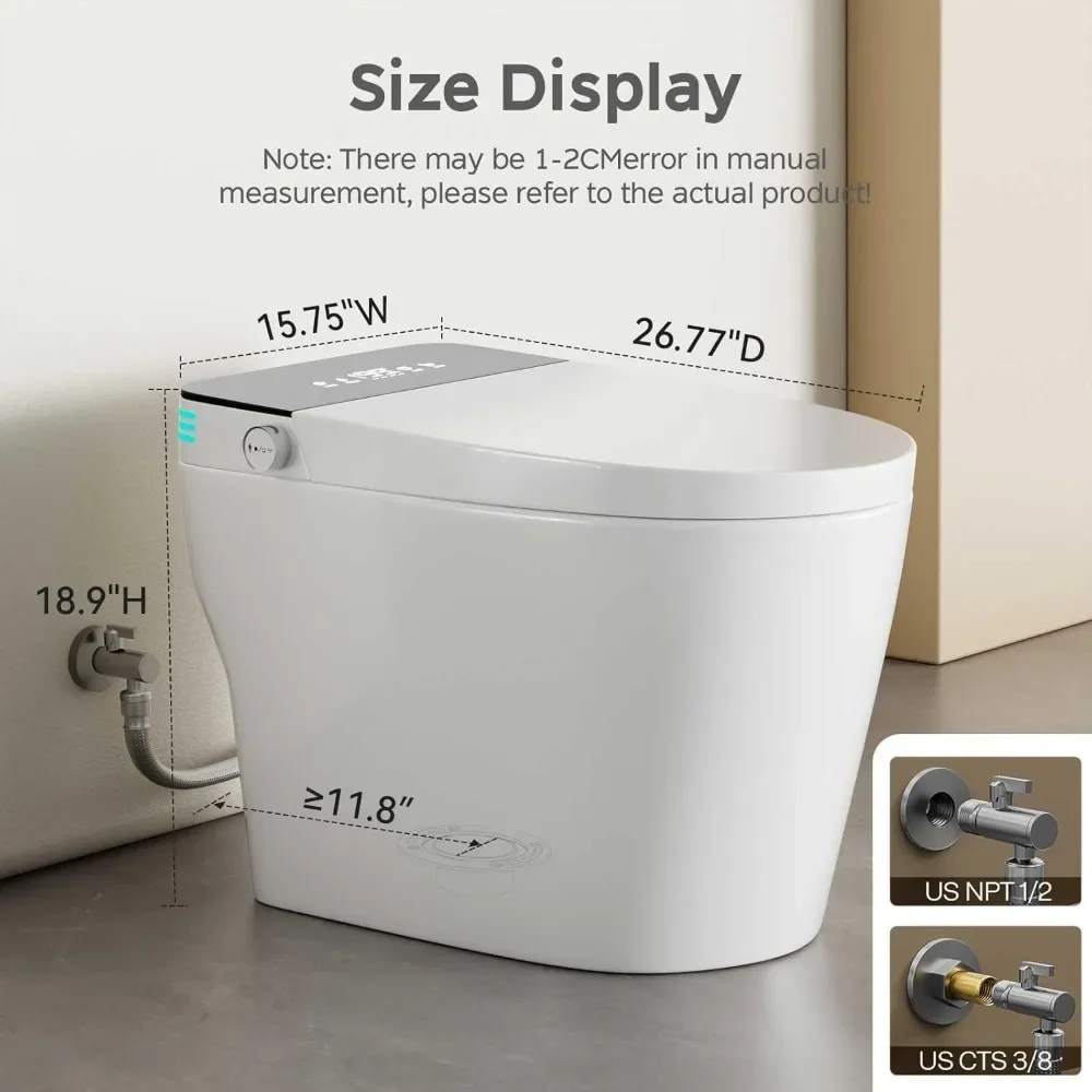 - 【Efficient Flush & Energy-Saving Design】This smart toilet features a highly efficient 1.28 GPF water-saving dual flush system with a 360° powerful flush to ensure thorough cleaning every time. Even in power outages, the manual side knob ensures uninterrupted flushing performance. Its tankless design saves space and eliminates leaks, making it ideal for compact bathrooms or modern layouts. With its eco-friendly water usage, it combines performance with sustainability for any household.