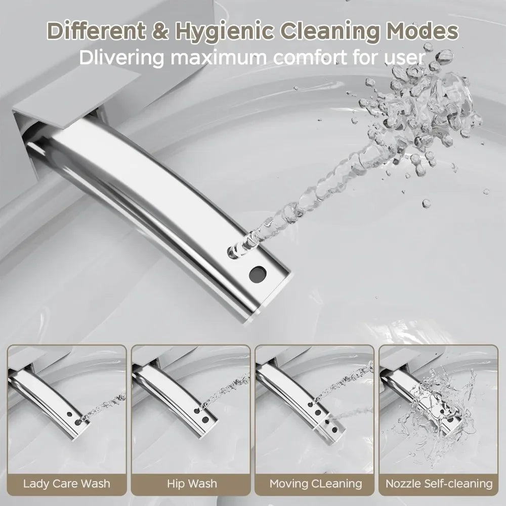 - 【Multi-Functional Cleaning Modes】This smart bidet toilet offers feminine care, posterior cleaning, and massage cleaning modes to meet diverse user needs. The self-cleaning nozzle and warm air drying system ensure maximum hygiene and comfort every time. The foam shield technology adds an extra layer of cleanliness, creating a spa-like experience in your bathroom.