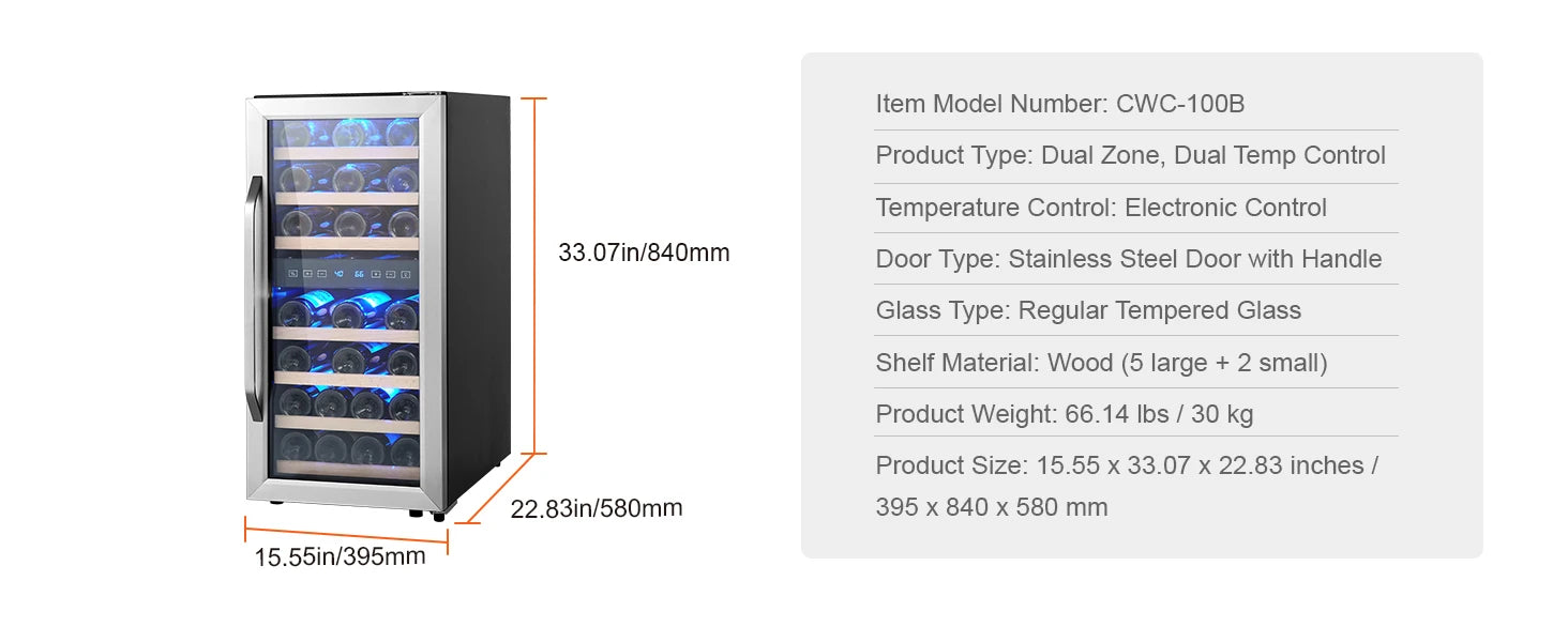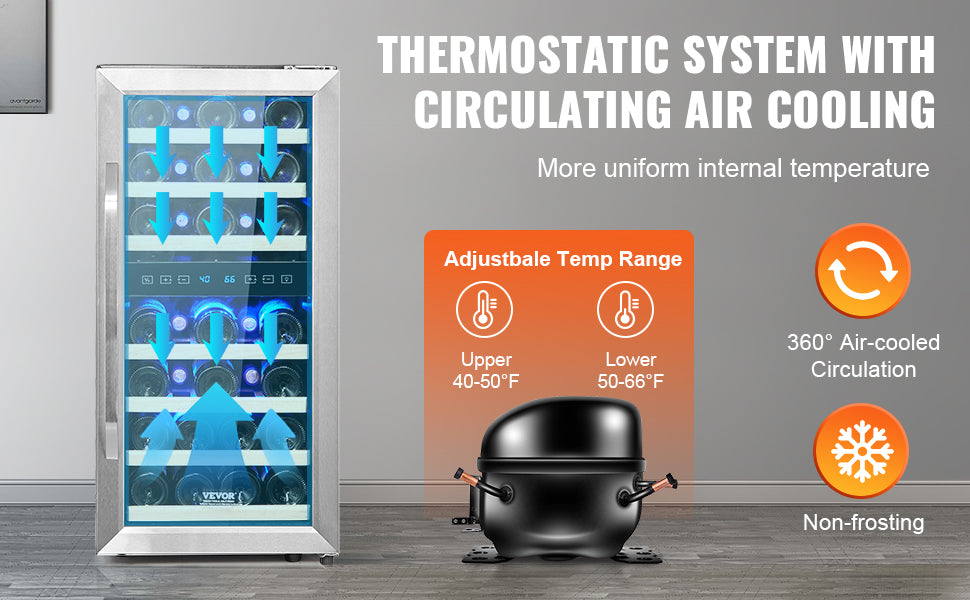 33-Bottle Capacity: The VEVOR freestanding wine cooler holds up to 33 bottles of 750ml wine. Whether you’re a wine enthusiast or collector, this cooler provides ample space to showcase and age your favorite wines.
