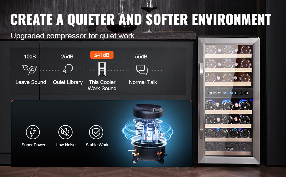 Silent Operation: Featuring an advanced compressor that delivers rapid, powerful, and stable cooling with precise humidity control, ensuring your beverages remain in perfect condition. Low-vibration operation keeps noise levels below 41 decibels, creating a quiet environment.