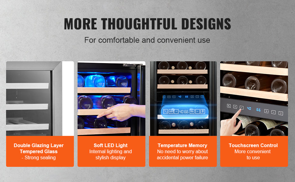 Thoughtful Details: The double-layered tempered glass door not only insulates the interior but also protects your collection from harmful UV rays. Adjustable wood shelves are easily removable; soft LED lighting illuminates the interior for easy access to your collection. Temperature memory function resumes the original settings after a power outage. Touchscreen controls make operation convenient, and the front ventilation ensures effective heat dissipation.